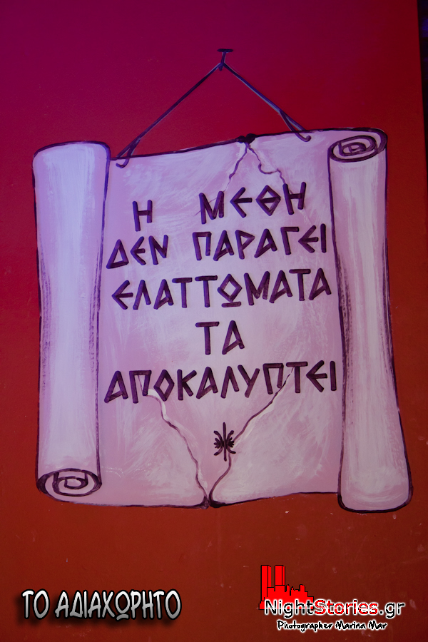 Εδώ επικρατεί το “ΑΔΙΑΧΏΡΗΤΟ”, γνώρισε το και ζήσε μια ξεχωριστή live ρεμπέτικη βράδια συνοδευόμενη με καλό φαγητό, πολύ κέφι, ασταμάτητο χορό και λουλούδια… Μια διασκέδαση άκρως φιλόξενη και Ελληνική, σας περιμένουμε όλους να περάσουμε όμορφα. Τοποθεσία : Πανόρμου, Τηλ : 697 4731528: